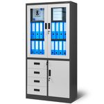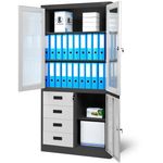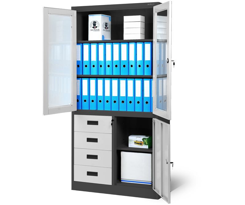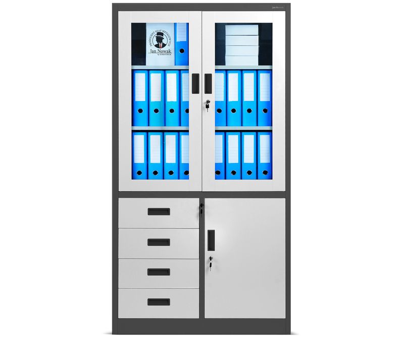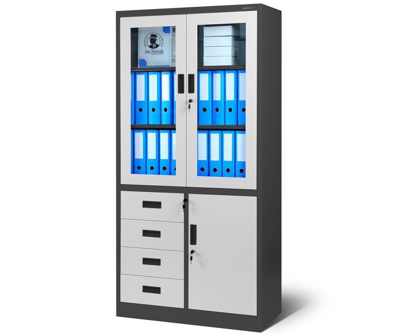 JAN NOWAK Dulap metalic vitrina WIOLA, antracit-alb Dulap birou JAN NOWAK model WIOLA - pentru dosare, documente, pentru birou, pentru cabinet, pentru secretariat, metalic, 90 cm Dulap metalic pentru birou cu o incuietoare prevazuta cu blocare in trei locuri cu cheie suplimentara, fabricat din materiale de cea mai buna calitate, cu capacitatea de incarcare a fiecarui raft de pana la 50 kg. Permite depozitarea documentelor in conformitate cu reglementarile RODO 2018. Va recomandam utilizarea acestui dulap multifunctional: dulap pentru dosare, documente, fisiere, accesorii poate fi folosit intr-un birou, secretariat, arhiva, cabinet sau firma potrivit si pentru un cabinet medical sau un centru medical este perfect pentru depozitarea echipamentelor medicale, medicamentelor, produselor medicamentoase Dulap metalic incapator WIOLA - durabil si functional Dulapul de arhivare WIOLA este un mobilier de birou inchis cu incuietoare care inchide in trei locuri. In vitrina are trei rafturi durabile pentru dosare, iar in sectiunea inferioara exista patru sertare practice si doua rafturi. In sectiunea superioara se pot depozita pana la 36 de dosare, in timp ce partea inferioara va permite sa va protejati obiectele private sau sa separati documentele. Dulapul metalic WIOLA este un produs realizat cu mare precizie si atentie la detalii. Dulapul nostru metalic a fost echipat cu gauri pe partea din spate si pe peretii laterali, care ii permit sa fie prins de peretele incaperii. Acest lucru va creste siguranta utilizarii zilnice. PRACTIC - Prevede 3 sertare pentru dosare in vitrina si o parte inferioara pentru documente si diverse accesorii. DURABIL - Realizate din otel de inalta calitate (0,6 mm), cu o constructie extrem de stabila si o capacitate de incarcare de pana la 50 kg pe raft. SPATIOS - Puteti depozita pana la 36 de dosare in zona de vitrina SIGUR - Sistem de inchidere in trei puncte + cheie de rezerva MODERN - Acoperit cu vopsea pulbere cu o combinatie de culori unica si eleganta Dulap metalic WIOLA - date tehnice inaltime: 185 cm latime: 90 cm adancime: 40 cm greutate: 45 kg Chiar mai mult: Garantie de calitate Indeplineste cerintele din Legea RODO din mai 2018 Dulapul este aprobat de catre PZH Merita stiut: Simplu si rapid de asamblat (instructiuni clare incluse) Mobilier de birou JAN NOWAK Descoperiti mobilierul metalic din colectia JAN NOWAK - unul dintre cei mai mari distribuitori de dulapuri metalice din Europa.