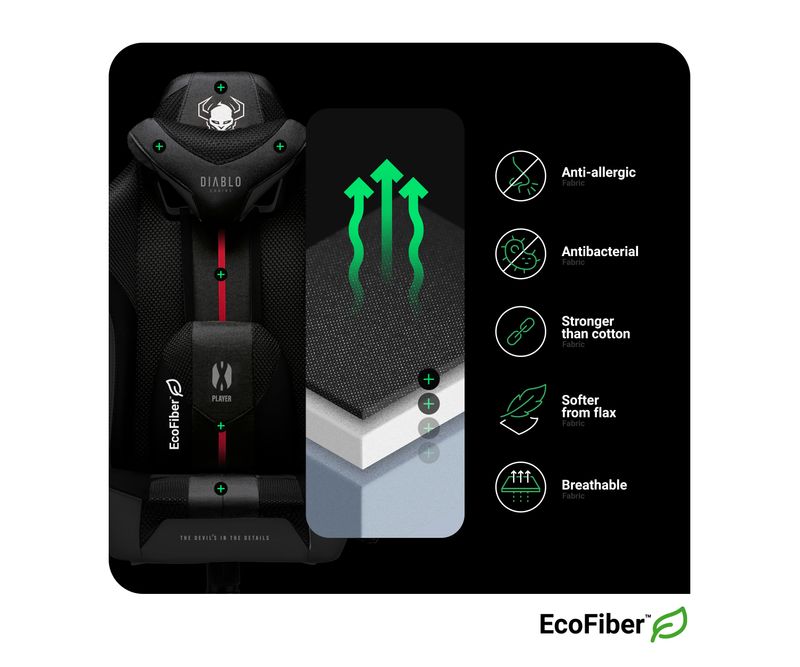 Uitati de supraincalzire si disconfort! Scaunul de gaming utilizeaza o combinatie de materiale pentru a asigura o circulatie optima a aerului. Tesatura rezistenta EcoFIber™ si plasa Diablo Honeycomb™ garanteaza respirabilitatea, in timp ce pielea ecologica HDS durabila ofera un finisaj unic partilor laterale ale scaunului. Aceasta tapiterie este rezistenta la abraziune si isi pastreaza intensitatea culorii timp de ani de zile.Un scaun adaptat nevoilor tale