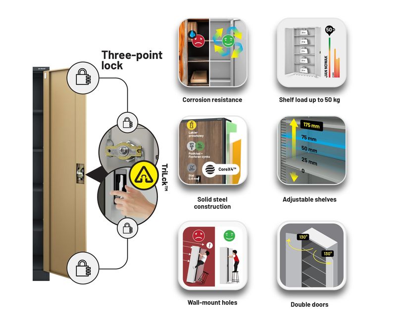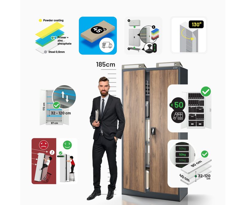 #html-body [data-pb-style=PY8QERA]{justify-content:flex-start;display:flex;flex-direction:column;background-position:left top;background-size:cover;background-repeat:no-repeat;background-attachment:scroll;margin-bottom:30px}#html-body [data-pb-style=LPT0S4M]{border-style:none}#html-body [data-pb-style=GU9F1R9],#html-body [data-pb-style=SLKCWCF]{max-width:100%;height:auto}#html-body [data-pb-style=U094EHS]{justify-content:flex-start;display:flex;flex-direction:column;background-position:left top;background-size:cover;background-repeat:no-repeat;background-attachment:scroll}@media only screen and (max-width: 768px) { #html-body [data-pb-style=LPT0S4M]{border-style:none} }Dulap JAN NOWAK Eco Design - otel, antracit, universal, pentru birou, scoala, atelier Exista multe modele de dulapuri pe piata, dar putine sunt la fel de versatile ca si dulapul metalic cu incuietoare JAN. Nu numai ca este excelent pentru depozitarea documentelor companiei, dar puteti pastra in el si medicamente sau tot felul de unelte in siguranta. Cele mai comune utilizari: dulap birou dulap medical dulap scule Companiile, scolile si birourile sunt principalii nostri clienti. Cu toate acestea, dulapurile cu incuietoare din otel JAN sunt din ce in ce mai mult folosite de persoanele fizice, care le aleg pentru a-si mobila interioarele datorita aspectului lor industrial minimalist si la moda. Dulap depozitare din metal JAN - caracteristici cheie ale produsului Dulapul de depozitare din metal JAN este un produs care nu numai ca este extrem de rezistent, dar este si conceput pentru a satisface toate cerintele utilizatorilor sai. Puteti adapta cu usurinta rafturile reglabile la nevoile D-voastra si puteti depozita in el tot ceea ce aveti nevoie. capacitate impresionanta (pana la 50 de dosare) 4 rafturi reglabile, fiecare cu o capacitate de incarcare de pana la 50 kg, reglabile in trepte de 25 mm. sistem de inchidere in 3 puncte (2 chei incluse) otel acoperit cu vopsea pulbere de 0,6 mm grosime, rezistent la deteriorari mecanice cu 2 usi dulapul nostru metalic a fost prevazut cu gauri pe partea din spate si laterala pentru a putea fi fixat pe un perete. Acest lucru va spori siguranta utilizarii zilnice. gaurile din partea superioara a dulapului fac posibila atasarea unei extensii. Specificatii - dulap metalic JAN inaltime 185 cm latime 90 cm adancime 40 cm greutate 40 kg culoare: nuc-antracit (RAL 7016) Motivul pentru care merita? Garantie -Cele mai bune materiale si fara compromisuri in ceea ce priveste calitatea fabricatiei. Beneficiati de o garantie de calitate! Siguranta - Dulapul din otel JAN este certificat de Institutul National de Igiena. Acest lucru inseamna ca il puteti utiliza liber pentru a va indeplini scopurile. RODO 2018 - Dulapul de arhivare JAN a fost dezvoltat cu scopul RODO 2018 in minte si indeplineste toate cerintele asociate cu reglementarile. Important: Dulapul de birou metalic este livrat pe bucati si, prin urmare, necesita montare. Colectia JAN NOWAK Garantia celei mai inalte calitati este oferita de marca JAN NOWAK, unul dintre cei mai mari furnizori de dulapuri metalice din Europa. Nu uitati ca, apeland la serviciile unei unitati apreciate si dovedite, va puteti baza pe produse si servicii de inalta calitate.