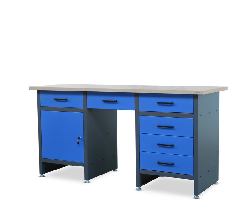 Banc de lucru, blat de lucru FRANK — albastru antracit Bancul de lucru sigur FRANK de Jan Nowak va va transforma munca in atelier. Pe bancul de lucru comod, fiecare sarcina va fi mult mai placuta si mai usor de realizat. Suprafata de lucru este imensa, astfel incat puteti pune cu usurinta toate piesele, uneltele, o ceasca de cafea pe ea si tot va ramane mult spatiu liber. Bancul de lucru are o latime de pana la 170 cm, o adancime de 60 cm si o grosime de 3 cm. Este fabricat din drevotriskova deska laminata si rezistenta. Al doilea element important al bancului de lucru FRANK este constructia metalica. Cadrul, sertarele, usile dulapului si rafturile sunt realizate din otel inoxidabil rezistent. Un strat de vopsea pulbere protejeaza impotriva umezelii si a deteriorarilor mecanice. Bancul de scule va ramane in stare excelenta timp de ani de zile. In plus, finisajul estetic placut si alegerea culorilor il fac sa arate foarte bine. Cadrul albastru antracit si blatul de culoare deschisa reprezinta o combinatie extrem de atractiva. Caracteristici principale ale bancului de lucru FRANK Lucrati comod: exista un spatiu in mijlocul bancului de scule, astfel incat sa puteti sta confortabil la masa de lucru, toate uneltele D-voastra se vor potrivi in cele 6 sertare si in dulap. Robust si usor de curatat: bancul de lucru metalic este fabricat din otel inoxidabil si protejat cu un strat de vopsea pulbere. Nu veti ramane niciodata fara spatiu: un avantaj urias al modelului FRANK este dimensiunea mesei de lucru, dimensiunile sale fiind de 170 cm x 60 cm x 3 cm (L x l x H). Rezistenta bancului de scule: constructia din otel este extrem de stabila, puteti incarca masa pana la 570 kg, sertarul poate sustine obiecte cu o greutate totala de 45 kg, iar rafturile 50 kg. Banc pentru garaj si atelier: bancul de lucru comod FRANK este o optiune excelenta pentru pasionatii de bricolaj si pentru adevaratii profesionisti. Lucru ergonomic Banc pentru garaj FRANK are picioare reglabile care permit echilibrarea blatului. Astfel, indiferent de situatie si de starea podelei, mobilierul va sta intotdeauna drept. Acest lucru va face ca sarcinile care necesita cea mai mare precizie sa fie o placere. Munca manuala poate dura mult timp, asa ca merita sa va asigurati un loc de munca confortabil. Un banc de lucru generos si stabil este esential, dar si spatiul de depozitare este extrem de important. Bancul pentru scule FRANK va va facilita organizarea locului de munca, deoarece puteti depozita echipamentul necesar in 6 sertare si un dulap cu cheie. Odata ce veti avea toate uneltele la indemana, nu va mai trebui sa intrerupeti munca de fiecare data pentru a merge la dulapul de scule. Faptul de a putea sta la bancul de lucru este un avantaj nepretuit, mai ales pentru sarcinile care necesita mai multe ore pentru a fi finalizate. Exista un spatiu in mijlocul mobilierului, astfel incat sa puteti apropia scaunul de blatul mesei. Banc de lucru pentru fiecare spatiu Suprafata de lucru a bancului de lucru FRANK este extrem de larga, de 170 cm si adanca de numai 60 cm. Prin urmare, piesa de mobilier se adapteaza perfect spatiului in care este amplasata si permite o trecere libera. Aceasta este o solutie excelenta pentru incaperile inguste si cu dimensiuni disproportionate. Bancul de lucru metalic FRANK este fabricat din otel inoxidabil foarte rezistent, care este acoperit suplimentar cu vopsea pulbere. Este excelent protejat impotriva formarii de coroziune. Puteti fi siguri de starea sa, chiar daca folositi cleiuri, uleiuri, substante chimice si exista o umiditate ridicata in incapere. Modelul Frank va functiona cu siguranta bine ca banc de lucru pentru garaj, atelier, fabrica sau depozit. Banc de lucru FRANK - specificatii: Culoare: albastru antracit Inaltimea: 85 cm Latimea blatului: 170 cm Adancimea: 60 cm Grosimea mesei: 3 cm Materialul blatului de masa: panou din lemn de placi aglomerate laminat Constructia mesei: otel inoxidabil acoperit cu vopsea pulbere Greutate: 85.4 kg Greutatea maxima: 570 kg Greutatea permisa pe raft: 50 kg Greutatea admisa a sertarelor: 45 kg Filetul picioarelor reglabile: 9 mm