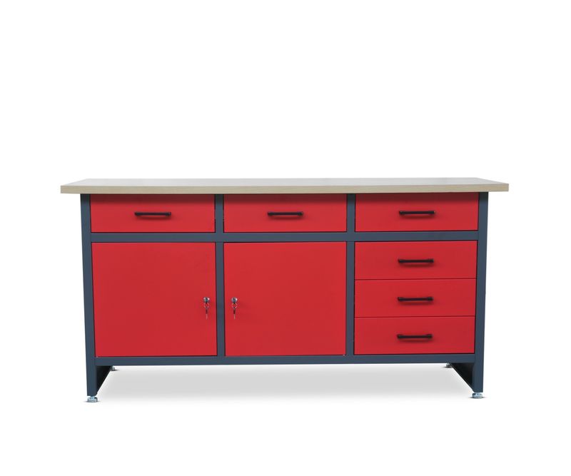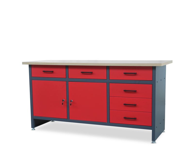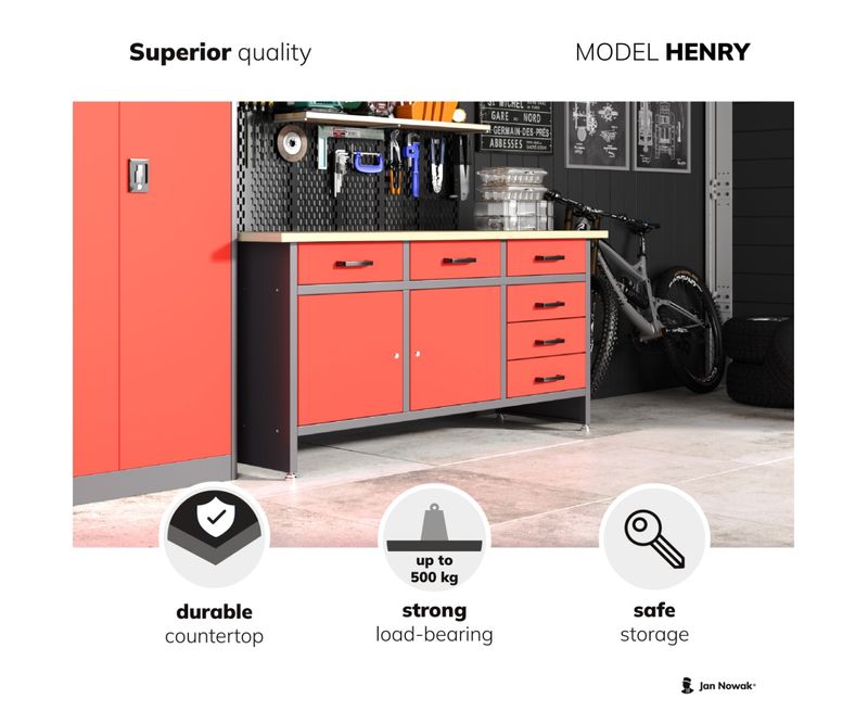 Banc de lucru mare Jan Nowak model HENRY Daca un banc de lucru mare si confortabil este o prioritate pentru D-voastra atunci cand vine vorba de mobilier de atelier, bancul de lucru HENRY de la Jan Nowak va fi cea mai buna alegere. Acesta este fabricat din placa din lemn de placi aglomerate laminat durabil si rezistent, avand dimensiunile de 170 cm x 60 cm x 3 cm, precum si o constructie din otel inoxidabil rezistent la deteriorare. Bancul de lucru HENRY se remarca prin spatiul sau imens de depozitare. Toate uneltele D-voastra, chei, surubelnite, piulite, suruburi, lipici, isi vor gasi locul intr-unul dintre cele sase sertare sau doua dulapuri. Acest lucru va face ca pastrarea postului de lucru ordonat sa fie usoara si placuta. Bancul de lucru HENRY este proiectat pentru a fi asamblat. De ce sa alegeti bancul de lucru HENRY? Un blat mai mare pentru un lucru confortabil: tabla din lemn de placi aglomerate laminata din care este confectionata are o latime de pana la 170 cm, o adancime de 60 cm si o grosime de 3 cm. Constructie metalica robusta: cadrul durabil din otel inoxidabil acoperit cu vopsea pulbere este rezistent si usor de intretinut. Suprafata maxima de depozitare: cu 6 sertare incapatoare si 2 dulapuri cu cheie, acesta este un favorit in topul bancurilor de lucru. Un centru puternic pentru atelier: capacitatea de incarcare a unui singur sertar este de 45 kg, a unui raft de 50 kg, iar capacitatea maxima de incarcare a mesei de lucru este de 570 kg. O solutie pentru cei pretentiosi: bancul de lucru mare HENRY va satisface nevoile profesionistilor, dar si ale pasionatilor de bricolaj de acasa si este potrivit pentru atelier, garaj, depozit. Blatul de lucru XXL Bancul de lucru HENRY este un model cu o suprafata de lucru imensa. Totul datorita dimensiunilor sale unice. Suprafata de lucru are o adancime de 60 cm, in timp ce latimea sa este considerabil extinsa la 170 cm. Indiferent daca creati mobilier sau reparati aparate, cu siguranta nu veti duce lipsa de spatiu pentru sarcinile D-voastra. Extinderea unei singure dimensiuni este o solutie originala si convenabila. Castigati mai mult spatiu de lucru, in timp ce, in acelasi timp, mobilierul nu aglomereaza spatiul si se potriveste perfect in incaperile lungi si inguste. Banc de lucru si dulap intr-unul singur Daca va confruntati cu o alegere de mobilier de atelier pentru o camera medie sau mica, bancul de lucru HENRY se va dovedi a fi o optiune excelenta. In loc sa creati un set format dintr-un blat de lucru nu foarte confortabil si un mic dulap pentru bancul de lucru, optati pentru o singura piesa de mobilier. O masa cu un spatiu de lucru amplu si, in plus, cu cea mai mare suprafata de depozitare posibila. Masa de lucru HENRY are 6 sertare incapatoare si 2 dulapuri cu cheie, astfel incat poate inlocui cu succes un dulap de scule. Tot ceea ce aveti nevoie pentru munca D-voastra va fi intotdeauna la indemana si perfect aranjat. Chiar daca nu sunteti foarte organizat si daca ordinea nu este punctul D-voastra forte, bancul de lucru HENRY are doar compartimente de depozitare cu cheie. Ceea ce va ascunde eficient toate imperfectiunile. Calitate superioara a manoperei Banc de lucru HENRY este o piesa de mobilier grozava pentru atelier, atelier de artizanat, depozit sau garaj. Este fabricat din otel inoxidabil robust, care se comporta bine in conditii dificile. Chiar si intr-o incapere umeda si neincalzita, pe suprafata sa nu va aparea rugina. Bancul de lucru va ramane in forma excelenta timp de ani de zile. Cadrul metalic este acoperit cu vopsea pulbere pentru o protectie suplimentara. Acoperirea suplimentara protejeaza mobilierul, dar ii confera si o culoare interesanta. Bancul de lucru rosu-antracit combinat cu blatul de culoare deschisa va adauga un plus de caracter incaperii. Un banc de lucru care se misca este necazul oricarui mester de bricolaj. Bancul de lucru HENRY va sta in picioare chiar si pe o podea stramba, deoarece este echipat cu picioare reglabile in inaltime. Este nevoie doar de cateva momente pentru a echilibra perfect mobilierul. Banc de lucru ERIC — specificatii: Culoare: rosu-antracit (RAL 7016 - RAL 3020) Inaltimea banc de lucru: 85 cm Latimea blatului de masa: 170 cm Adancimea mesei: 60 cm Grosimea mesei: 3 cm Material blat masa: panou din lemn de placi aglomerate laminat Constructia mesei: otel inoxidabil acoperit cu vopsea pulbere Greutate: 91.3 kg Greutatea maxima: 570 kg Greutatea permisa pe raft: 50 kg Greutatea admisa a sertarelor: 45 kg Filetul picioarelor reglabile: 9 mm