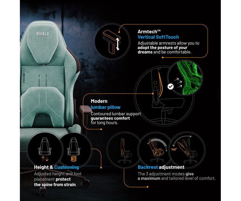 Ti se intampla sa uiti de tot in jur atunci cand te prinde un joc? Atunci, cu siguranta ai simtit dureri de spate sau gat intepenit. Scaunul de gaming Diablo X.One Prime vine in ajutorul tau! Gandit pana la cel mai mic detaliu, acest scaun este partenerul tau de incredere in orele lungi petrecute la birou – in joc sau in munca. Mizeaza pe ergonomie si stil de clasa premium!X.One Prime Mystic Mint – Confort intr-o nuanta proaspata de menta