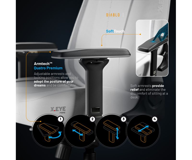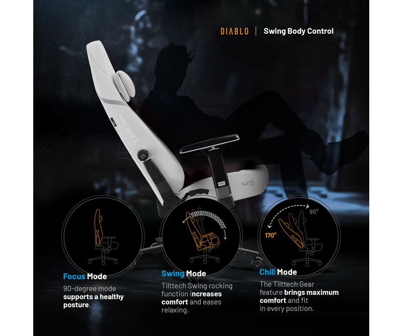 Un scaun de birou confortabil nu poate exista fara o gama extinsa de optiuni de reglare si personalizare. Mecanismul precis Tilttech™ Lift va permite sa reglati inaltimea in functie de inaltimea dvs., in timp ce Tilttech™ Gear va permite sa reglati unghiul pana la 170° si sa blocati pozitia. Puteti chiar sa va intindeti pe scaunul X.Eye Prime! Tilttech™ Swing, pe de alta parte, va introduce balansarea relaxanta in sesiunile dvs. de jocuri, cu optiunea de a bloca scaunul in 5 pozitii.Scaun de gaming cu cotiere reglabile
