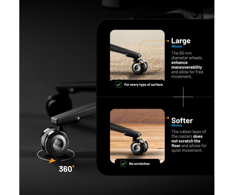 Baza metalica durabila si cilindrul pneumatic de clasa 4 asigura fiabilitate la o sarcina de pana la 140 kg. Rolele silentioase acoperite cu cauciuc protejeaza podeaua de zgarieturi si permit deplasarea lina pe orice suprafata, de la laminat la mocheta.