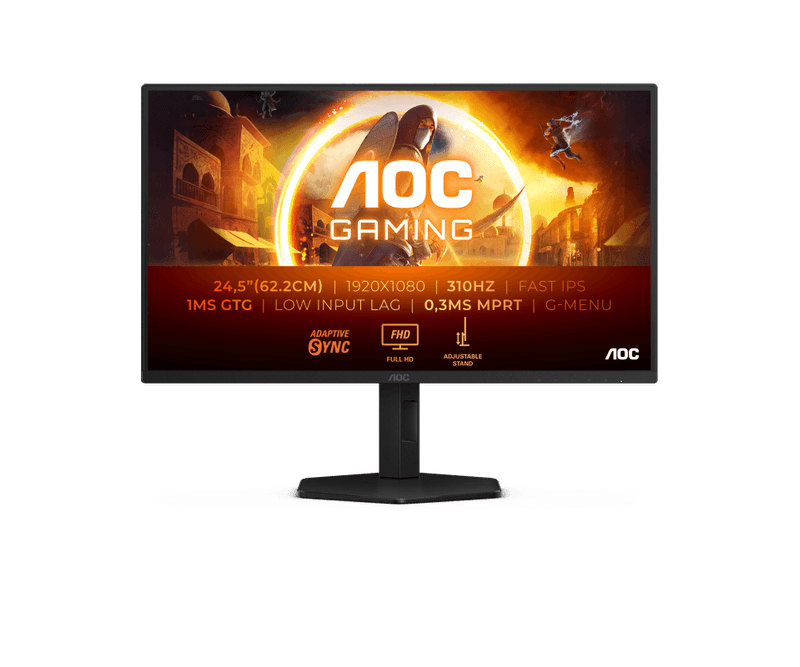 Monitor AOC 24.5 25G4SXU, Diagonal (inch): 24.5, Diagonal (cm): 62.2, Aspect ratio: 16:9, Panel: IPS, Resolution: 1920x1080, Refresh Rate: 310Hz, Response time GtG: 1ms, Response time MPRT: 0.3ms, Brightness (max): 400 cd/m², Contrast (static) : 1000:1, Viewing angle: 178/178, Color Gamut Type: DCI-P3, Color Gamut Coverage: 90.6%, Colours: 16.7M, VESA Wallmount: 100x100, Tilt: -3.5/+21.5, HAS: 130mm, Pivot: 90°, Swivel: -30/30, D-SUB: 0, HDMI: x2, DisplayPort: x1, USB Hub: 1 up USB 3.2 Gen1, 3 down USB, AUX: x1 3.5mm Audio OUT