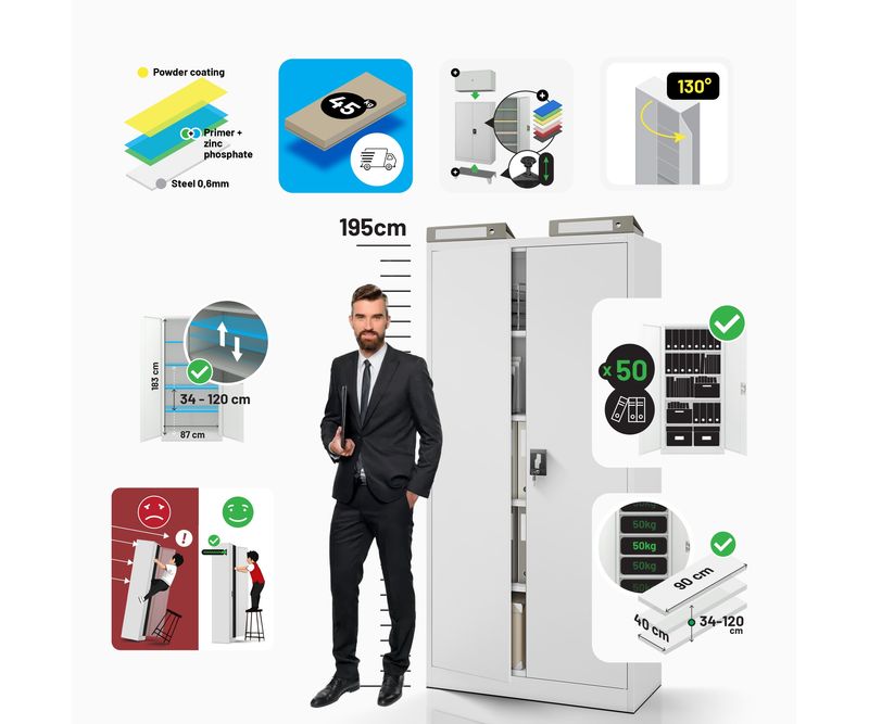 Dulap JAN H - otel, antracit, universal, pentru birou, scoala, atelier Exista multe modele de dulapuri pe piata, dar putine sunt la fel de versatile ca si dulapul metalic cu incuietoare JAN. Nu numai ca este excelent pentru depozitarea documentelor companiei, dar puteti pastra in el si medicamente sau tot felul de unelte in siguranta. Cele mai comune utilizari: dulap birou dulap medical dulap scule Companiile, scolile si birourile sunt principalii nostri clienti. Cu toate acestea, dulapurile cu incuietoare din otel JAN sunt din ce in ce mai mult folosite de persoanele fizice, care le aleg pentru a-si mobila interioarele datorita aspectului lor industrial minimalist si la moda. Dulap depozitare din metal JAN - caracteristici cheie ale produsului Dulapul de depozitare din metal JAN este un produs care nu numai ca este extrem de rezistent, dar este si conceput pentru a satisface toate cerintele utilizatorilor sai. Puteti adapta cu usurinta rafturile reglabile la nevoile D-voastra si puteti depozita in el tot ceea ce aveti nevoie. capacitate impresionanta (pana la 50 de dosare) 4 rafturi reglabile, fiecare cu o capacitate de incarcare de pana la 50 kg, reglabile in trepte de 25 mm. sistem de inchidere in 3 puncte (2 chei incluse) otel acoperit cu vopsea pulbere de 0,6 mm grosime, rezistent la deteriorari mecanice cu 2 usi dulapul nostru metalic a fost prevazut cu gauri pe partea din spate si laterala pentru a putea fi fixat pe un perete. Acest lucru va spori siguranta utilizarii zilnice. gaurile din partea superioara a dulapului fac posibila atasarea unei extensii. Specificatii - dulap metalic JAN inaltime 195 cm latime 90 cm adancime 40 cm greutate 45 kg culoare: gri (RAL 7035) Motivul pentru care merita? Garantie de calitate - Cele mai bune materiale si fara compromisuri in ceea ce priveste calitatea fabricatiei. Siguranta - Dulapul din otel JAN este certificat de Institutul National de Igiena. Acest lucru inseamna ca il puteti utiliza liber pentru a va indeplini scopurile. RODO 2018 - Dulapul de arhivare JAN a fost dezvoltat cu scopul RODO 2018 in minte si indeplineste toate cerintele asociate cu reglementarile. Important: Dulapul de birou metalic este livrat pe bucati si, prin urmare, necesita montare. Colectia JAN NOWAK Garantia celei mai inalte calitati este oferita de marca JAN NOWAK, unul dintre cei mai mari furnizori de dulapuri metalice din Europa. Nu uitati ca, apeland la serviciile unei unitati apreciate si dovedite, va puteti baza pe produse si servicii de inalta calitate.