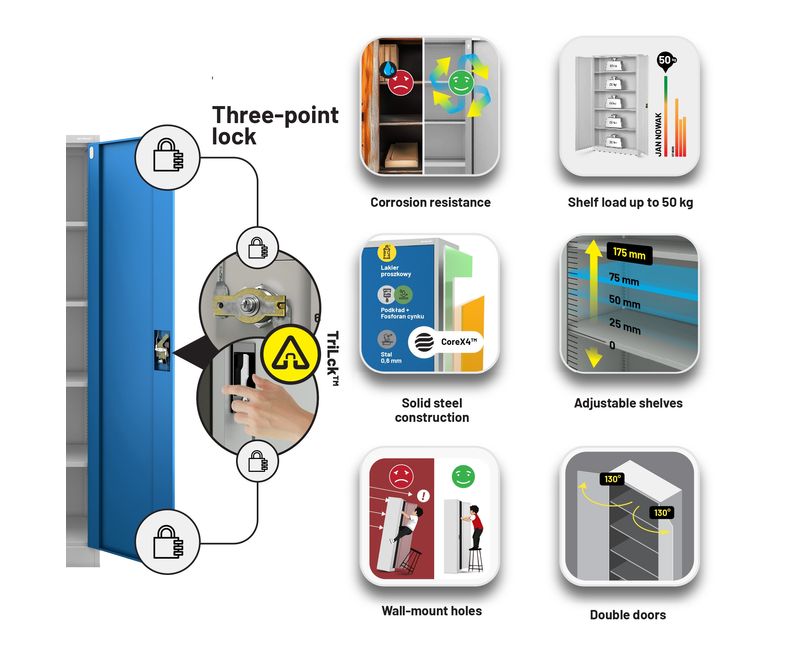 #html-body [data-pb-style=S6VPP17]{justify-content:flex-start;display:flex;flex-direction:column;background-position:left top;background-size:cover;background-repeat:no-repeat;background-attachment:scroll;margin-bottom:30px}#html-body [data-pb-style=QAE0XI2]{border-style:none}#html-body [data-pb-style=T2WYHNI],#html-body [data-pb-style=T8P7KJH]{max-width:100%;height:auto}#html-body [data-pb-style=X5CB088]{justify-content:flex-start;display:flex;flex-direction:column;background-position:left top;background-size:cover;background-repeat:no-repeat;background-attachment:scroll}@media only screen and (max-width: 768px) { #html-body [data-pb-style=QAE0XI2]{border-style:none} }Dulap JAN NOWAK - otel, antracit, universal, pentru birou, scoala, atelier Exista multe modele de dulapuri pe piata, dar putine sunt la fel de versatile ca si dulapul metalic cu incuietoare JAN. Nu numai ca este excelent pentru depozitarea documentelor companiei, dar puteti pastra in el si medicamente sau tot felul de unelte in siguranta. Cele mai comune utilizari: dulap birou dulap medical dulap scule Companiile, scolile si birourile sunt principalii nostri clienti. Cu toate acestea, dulapurile cu incuietoare din otel JAN sunt din ce in ce mai mult folosite de persoanele fizice, care le aleg pentru a-si mobila interioarele datorita aspectului lor industrial minimalist si la moda. Dulap depozitare din metal JAN - caracteristici cheie ale produsului Dulapul de depozitare din metal JAN este un produs care nu numai ca este extrem de rezistent, dar este si conceput pentru a satisface toate cerintele utilizatorilor sai. Puteti adapta cu usurinta rafturile reglabile la nevoile D-voastra si puteti depozita in el tot ceea ce aveti nevoie. capacitate impresionanta (pana la 50 de dosare) 4 rafturi reglabile, fiecare cu o capacitate de incarcare de pana la 50 kg, reglabile in trepte de 25 mm. sistem de inchidere in 3 puncte (2 chei incluse) otel acoperit cu vopsea pulbere de 0,6 mm grosime, rezistent la deteriorari mecanice cu 2 usi dulapul nostru metalic a fost prevazut cu gauri pe partea din spate si laterala pentru a putea fi fixat pe un perete. Acest lucru va spori siguranta utilizarii zilnice. gaurile din partea superioara a dulapului fac posibila atasarea unei extensii. Specificatii - dulap metalic JAN inaltime 185 cm latime 90 cm adancime 40 cm greutate 40 kg Motivul pentru care merita? Garantie de calitate -Cele mai bune materiale si fara compromisuri in ceea ce priveste calitatea fabricatiei. Siguranta - Dulapul din otel JAN este certificat de Institutul National de Igiena. Acest lucru inseamna ca il puteti utiliza liber pentru a va indeplini scopurile. RODO 2018 - Dulapul de arhivare JAN a fost dezvoltat cu scopul RODO 2018 in minte si indeplineste toate cerintele asociate cu reglementarile. Important: Dulapul de birou metalic este livrat pe bucati si, prin urmare, necesita montare. Colectia JAN NOWAK Garantia celei mai inalte calitati este oferita de marca JAN NOWAK, unul dintre cei mai mari furnizori de dulapuri metalice din Europa. Nu uitati ca, apeland la serviciile unei unitati apreciate si dovedite, va puteti baza pe produse si servicii de inalta calitate.