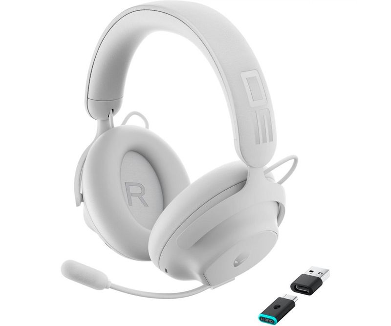 Alienware Pro Wireless Gaming Headset, Connectivity Technology: Wired/Wireless, Wireless Technology: Bluetooth, Wireless Operating Distance: 30m, Bluetooth Standard: Bluetooth 5.3, Impedance: 32 Ohm, Features: 50mm graphene-coated drivers, 2-mic AI noise cancellation, ANC, Noise Canceling: Yes, Fast Charging: Yes, Active Noise Canceling (ANC): Yes, Active Noise Canceling (ANC) Technology: Hybrid, Hi-Res Audio: Yes, Special Material: Graphene coated, Frequency Response: 20Hz-40KHz, Battery Information: Battery Capacity: 750 mAh, Fast Charging Time: 15 minutes for up to 6 hours listening time, Battery Talk Time: Up to 35 hours (ANC off), Up to 25 hours (ANC on), Listening time: Up to 75 hours (Bluetooth) / 70 hours (2.4GHz) with ANC off, Up to 35 hours (2.4GHz) with ANC on, Battery Rechargeable: Yes, Earpiece Design: Over-the-ear, Driver Size: 50mm, Microphone Technology: Uni-directional, 2-Mic AI Noise Cancellation, Microphone Design: Boom, Detachable Microphone: Yes, Host Interface: USB Type-A, USB Type-C, Charging Interface: USB Type-A, Earpiece Controls: Volume, Mic Control (mute/unmute), ANC mode control button (on/off/transparency), Power On / Off, 2.4GHz/Bluetooth/Pairing, Colour: Lunar Light, Ear Cushion Material: Memory Foam, Leatherette, Form Factor: Circumaural, Height: 20.5 cm, Width: 15 cm, Depth: 9 cm, Weight (Approximate): 315 g, Package Contents: Pro Wireless Gaming Headset, USB-C Wireless Dongle, USB-A to USB-C Adapter, USB-A to USB-C Cable, Detachable Boom Mic, Mic Shield, Documents, Application/Usage: PC, Gaming Console, Mobile, Compatibility: Playstation 4, Playstation 5, Nintendo Switch, Operating System Platform: Windows 10, Windows 11, Android, iOS, Limited Warranty: 2 Year