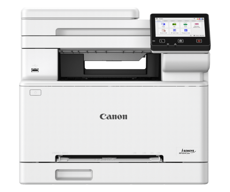Multifunctional color Canon i-SENSYS MF664Cdw, Tehnologie: Laser, Format: A4, Functii: Print, copy, scan, Viteza printare max: 25ppm, Rezolutie 600x600dpi, max 1,200 × 1,200 dpi, Limbaje printare: UFR II, PCL 6, Duplex, copiere: viteza: 25ppm, Rezolutie: 600 × 600 dpi, zoom: 25 - 400%, Scanare: Rezolutie: 600 x 600 dpi, max 9,600 x 9,600 dpi , Senzor CIS, Viteza scanare: 40ipm, Scanare catre, USB, Retea, Capacitate hartie: 250Coli +50 coli ADF, Interfata: USB, Retea, WI-FI, Memorie 1GB, Stocare: 2GB, Display touchscreen 5, Volum maxim lunar: 30.000 pagini, Dimensiuni: 425 x 461 x 397 mm, 18.71kg, Consumabile: Tonere 075 BK 1400 pagini, 075 CMY 1300 pagini, 075H BK 3500pagini, 075H CMY 2500 pagini.