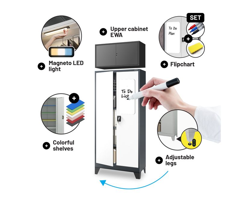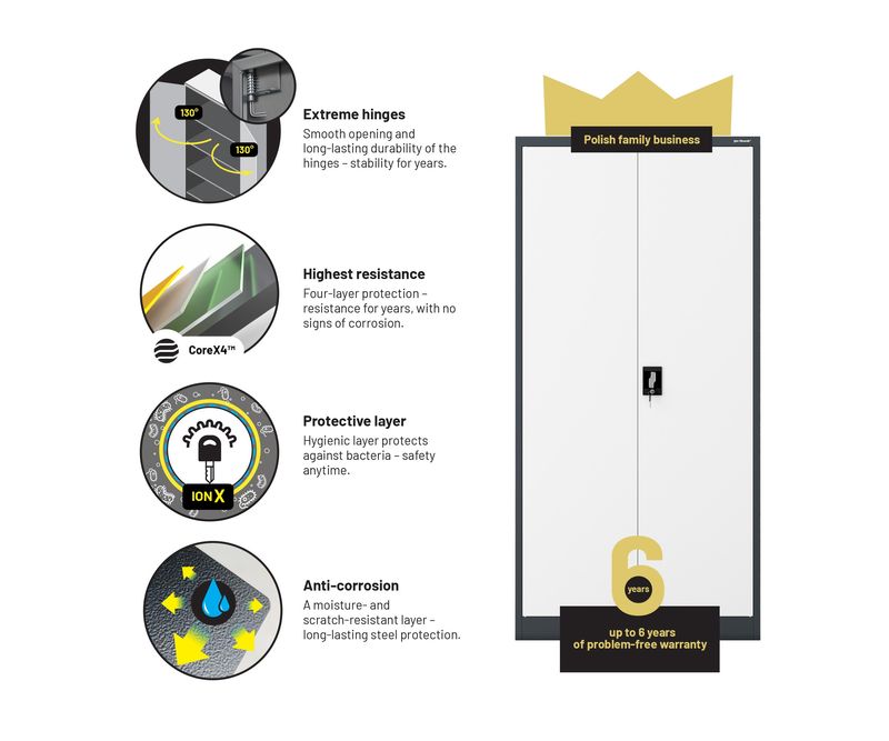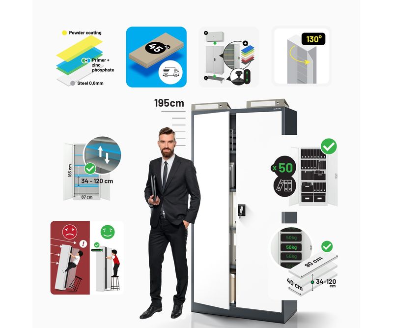 Dulap JAN H - otel, antracit, universal, pentru birou, scoala, atelier Exista multe modele de dulapuri pe piata, dar putine sunt la fel de versatile ca si dulapul metalic cu incuietoare JAN. Nu numai ca este excelent pentru depozitarea documentelor companiei, dar puteti pastra in el si medicamente sau tot felul de unelte in siguranta. Cele mai comune utilizari: dulap birou dulap medical dulap scule Companiile, scolile si birourile sunt principalii nostri clienti. Cu toate acestea, dulapurile cu incuietoare din otel JAN sunt din ce in ce mai mult folosite de persoanele fizice, care le aleg pentru a-si mobila interioarele datorita aspectului lor industrial minimalist si la moda. Dulap depozitare din metal JAN - caracteristici cheie ale produsului Dulapul de depozitare din metal JAN este un produs care nu numai ca este extrem de rezistent, dar este si conceput pentru a satisface toate cerintele utilizatorilor sai. Puteti adapta cu usurinta rafturile reglabile la nevoile D-voastra si puteti depozita in el tot ceea ce aveti nevoie. capacitate impresionanta (pana la 50 de dosare) 4 rafturi reglabile, fiecare cu o capacitate de incarcare de pana la 50 kg, reglabile in trepte de 25 mm. sistem de inchidere in 3 puncte (2 chei incluse) otel acoperit cu vopsea pulbere de 0,6 mm grosime, rezistent la deteriorari mecanice cu 2 usi dulapul nostru metalic a fost prevazut cu gauri pe partea din spate si laterala pentru a putea fi fixat pe un perete. Acest lucru va spori siguranta utilizarii zilnice. gaurile din partea superioara a dulapului fac posibila atasarea unei extensii. Specificatii - dulap metalic JAN inaltime 195 cm latime 90 cm adancime 40 cm greutate 45 kg culoare: antracit-alb (RAL 7016 - RAL 9003) Motivul pentru care merita? Garantie de calitate - Cele mai bune materiale si fara compromisuri in ceea ce priveste calitatea fabricatiei. Siguranta - Dulapul din otel JAN este certificat de Institutul National de Igiena. Acest lucru inseamna ca il puteti utiliza liber pentru a va indeplini scopurile. RODO 2018 - Dulapul de arhivare JAN a fost dezvoltat cu scopul RODO 2018 in minte si indeplineste toate cerintele asociate cu reglementarile. Important: Dulapul de birou metalic este livrat pe bucati si, prin urmare, necesita montare. Colectia JAN NOWAK Garantia celei mai inalte calitati este oferita de marca JAN NOWAK, unul dintre cei mai mari furnizori de dulapuri metalice din Europa. Nu uitati ca, apeland la serviciile unei unitati apreciate si dovedite, va puteti baza pe produse si servicii de inalta calitate.