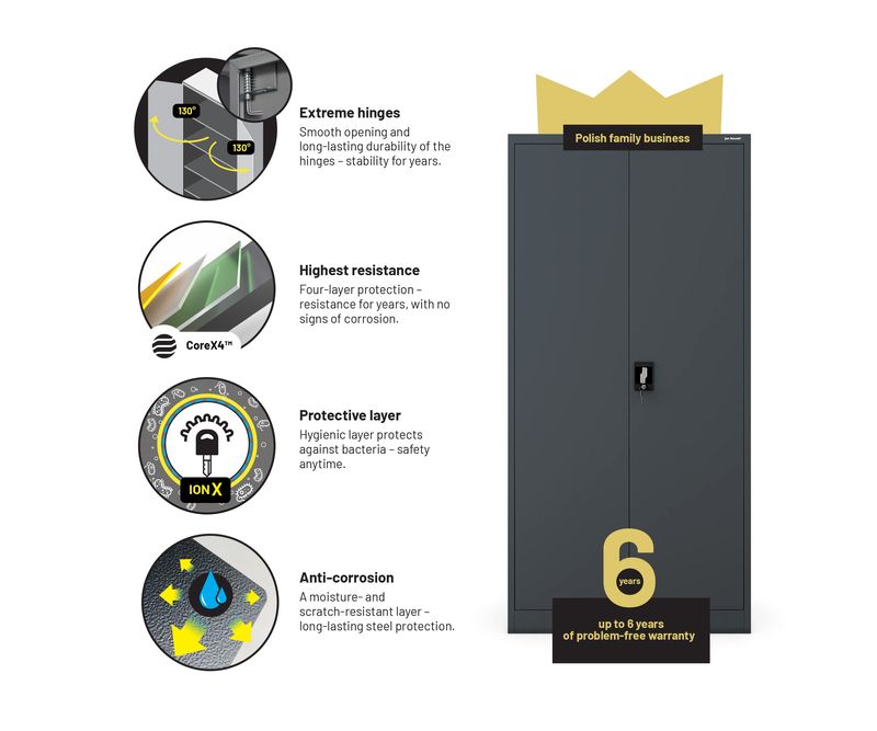 #html-body [data-pb-style=OXGR4DN]{justify-content:flex-start;display:flex;flex-direction:column;background-position:left top;background-size:cover;background-repeat:no-repeat;background-attachment:scroll;margin-bottom:30px}#html-body [data-pb-style=EFDYDOJ]{border-style:none}#html-body [data-pb-style=HRXKL4K],#html-body [data-pb-style=XNWI5GY]{max-width:100%;height:auto}#html-body [data-pb-style=QR33PE2]{justify-content:flex-start;display:flex;flex-direction:column;background-position:left top;background-size:cover;background-repeat:no-repeat;background-attachment:scroll}@media only screen and (max-width: 768px) { #html-body [data-pb-style=EFDYDOJ]{border-style:none} }Dulap JAN NOWAK - otel, antracit, universal, pentru birou, scoala, atelier Exista multe modele de dulapuri pe piata, dar putine sunt la fel de versatile ca si dulapul metalic cu incuietoare JAN. Nu numai ca este excelent pentru depozitarea documentelor companiei, dar puteti pastra in el si medicamente sau tot felul de unelte in siguranta. Cele mai comune utilizari: dulap birou dulap medical dulap scule Companiile, scolile si birourile sunt principalii nostri clienti. Cu toate acestea, dulapurile cu incuietoare din otel JAN sunt din ce in ce mai mult folosite de persoanele fizice, care le aleg pentru a-si mobila interioarele datorita aspectului lor industrial minimalist si la moda. Dulap depozitare din metal JAN - caracteristici cheie ale produsului Dulapul de depozitare din metal JAN este un produs care nu numai ca este extrem de rezistent, dar este si conceput pentru a satisface toate cerintele utilizatorilor sai. Puteti adapta cu usurinta rafturile reglabile la nevoile D-voastra si puteti depozita in el tot ceea ce aveti nevoie. capacitate impresionanta (pana la 50 de dosare) 4 rafturi reglabile, fiecare cu o capacitate de incarcare de pana la 50 kg, reglabile in trepte de 25 mm. sistem de inchidere in 3 puncte (2 chei incluse) otel acoperit cu vopsea pulbere de 0,6 mm grosime, rezistent la deteriorari mecanice cu 2 usi dulapul nostru metalic a fost prevazut cu gauri pe partea din spate si laterala pentru a putea fi fixat pe un perete. Acest lucru va spori siguranta utilizarii zilnice. gaurile din partea superioara a dulapului fac posibila atasarea unei extensii. Specificatii - dulap metalic JAN inaltime 185 cm latime 90 cm adancime 40 cm greutate 40 kg Motivul pentru care merita? Garantie de calitate -Cele mai bune materiale si fara compromisuri in ceea ce priveste calitatea fabricatiei. Siguranta - Dulapul din otel JAN este certificat de Institutul National de Igiena. Acest lucru inseamna ca il puteti utiliza liber pentru a va indeplini scopurile. RODO 2018 - Dulapul de arhivare JAN a fost dezvoltat cu scopul RODO 2018 in minte si indeplineste toate cerintele asociate cu reglementarile. Important: Dulapul de birou metalic este livrat pe bucati si, prin urmare, necesita montare. Colectia JAN NOWAK Garantia celei mai inalte calitati este oferita de marca JAN NOWAK, unul dintre cei mai mari furnizori de dulapuri metalice din Europa. Nu uitati ca, apeland la serviciile unei unitati apreciate si dovedite, va puteti baza pe produse si servicii de inalta calitate.