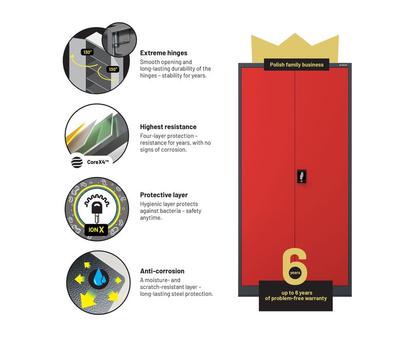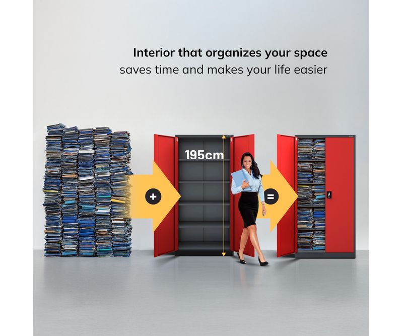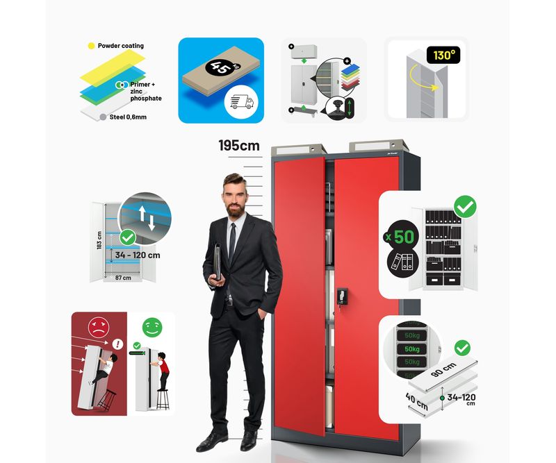 Dulap JAN H - otel, antracit, universal, pentru birou, scoala, atelier Exista multe modele de dulapuri pe piata, dar putine sunt la fel de versatile ca si dulapul metalic cu incuietoare JAN. Nu numai ca este excelent pentru depozitarea documentelor companiei, dar puteti pastra in el si medicamente sau tot felul de unelte in siguranta. Cele mai comune utilizari: dulap birou dulap medical dulap scule Companiile, scolile si birourile sunt principalii nostri clienti. Cu toate acestea, dulapurile cu incuietoare din otel JAN sunt din ce in ce mai mult folosite de persoanele fizice, care le aleg pentru a-si mobila interioarele datorita aspectului lor industrial minimalist si la moda. Dulap depozitare din metal JAN - caracteristici cheie ale produsului Dulapul de depozitare din metal JAN este un produs care nu numai ca este extrem de rezistent, dar este si conceput pentru a satisface toate cerintele utilizatorilor sai. Puteti adapta cu usurinta rafturile reglabile la nevoile D-voastra si puteti depozita in el tot ceea ce aveti nevoie. capacitate impresionanta (pana la 50 de dosare) 4 rafturi reglabile, fiecare cu o capacitate de incarcare de pana la 50 kg, reglabile in trepte de 25 mm. sistem de inchidere in 3 puncte (2 chei incluse) otel acoperit cu vopsea pulbere de 0,6 mm grosime, rezistent la deteriorari mecanice cu 2 usi dulapul nostru metalic a fost prevazut cu gauri pe partea din spate si laterala pentru a putea fi fixat pe un perete. Acest lucru va spori siguranta utilizarii zilnice. gaurile din partea superioara a dulapului fac posibila atasarea unei extensii. Specificatii - dulap metalic JAN inaltime 195 cm latime 90 cm adancime 40 cm greutate 45 kg culoare: rosu-antracit (RAL 3020 - RAL 7016) Motivul pentru care merita? Garantie de calitate - Cele mai bune materiale si fara compromisuri in ceea ce priveste calitatea fabricatiei. Siguranta - Dulapul din otel JAN este certificat de Institutul National de Igiena. Acest lucru inseamna ca il puteti utiliza liber pentru a va indeplini scopurile. RODO 2018 - Dulapul de arhivare JAN a fost dezvoltat cu scopul RODO 2018 in minte si indeplineste toate cerintele asociate cu reglementarile. Important: Dulapul de birou metalic este livrat pe bucati si, prin urmare, necesita montare. Colectia JAN NOWAK Garantia celei mai inalte calitati este oferita de marca JAN NOWAK, unul dintre cei mai mari furnizori de dulapuri metalice din Europa. Nu uitati ca, apeland la serviciile unei unitati apreciate si dovedite, va puteti baza pe produse si servicii de inalta calitate.