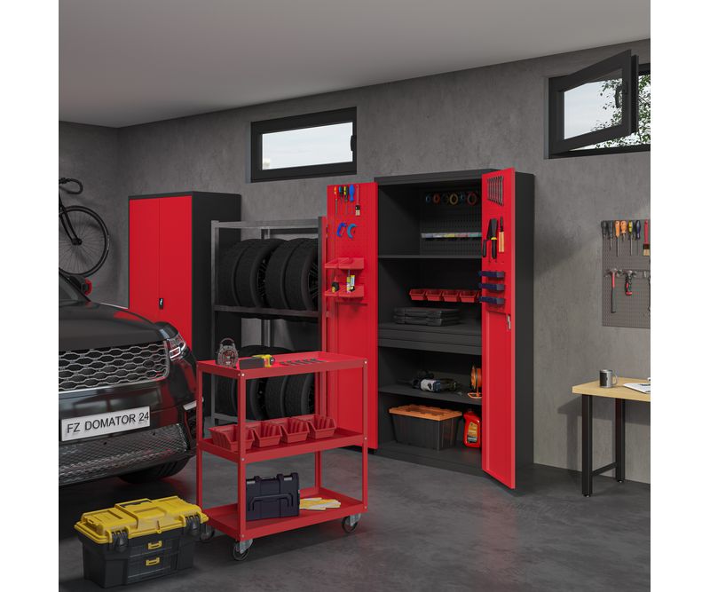 SZYMON - dulap metalic pentru atelier Dulapul de scule SZYMON este o piesa de mobilier indispensabila in fiecare atelier. Cu o serie de solutii moderne si practice, acest model robust va sustine munca zilnica acolo unde confortul si ergonomia sunt prioritare. In plus, dulapul are caracteristici de securitate in conformitate cu Legea RODO 2018. Verificati unde isi va dovedi valoarea dulapul din otel SZYMON: in atelierele mestesugarilor doteaza spatiile de productie concepute pentru atelierele de reparatii auto perfect pentru atelierele de vulcanizare. Dulap de atelier robust SZYMON - rezistent si sigur Descoperiti dulapul nostru modern de scule. Modelul SZYMON se distinge prin constructia sa extrem de stabila si rezistenta ridicata la deteriorari mecanice. Dulapul este fabricat din tabla de otel laminata la rece cu grosimea de 1,1 mm si, datorita corpului sau solid, ramane fixat chiar si sub sarcini grele. Datorita capacitatii sale surprinzator de mari, va permite sa depozitati cu usurinta unelte si accesorii si va ajuta sa organizati spatiul utilizabil al atelierului D-voastra si sa va imbunatatiti activitatea zilnica. Dispune de 3 rafturi reglabile, a caror pozitie poate fi adaptata in functie de nevoile specifice (capacitatea maxima de incarcare a fiecarui raft - 80 kg) si 2 sertare glisante care asigura accesul rapid la continut (capacitatea maxima de incarcare a fiecarui sertar - 40 kg). Structura perforata a usilor din interior va permite sa le personalizati in functie de nevoile D-voastra, iar incuietoarea de inalta calitate garanteaza ca uneltele D-voastra sunt in siguranta si protejate impotriva accesului neautorizat. CALITATE DE TOP - dulapul este fabricat din tabla de otel acoperit cu vopsea pulbere cu o grosime de pana la 1,1 mm! CAPACITATE SURPRINZATOARE - modelul SZYMON are 4 compartimente incapatoare pentru depozitarea sculelor si 2 sertare pe glisiere, care asigura accesul rapid la continut REZISTENTA RIDICATA - capacitatea maxima de incarcare a fiecarui sertar este de 40 kg, iar a raftului de 80 kg! SIGURANTA GARANTATA - mecanism de blocare cu incuietori pentru a asigura securitatea continutului si a preveni accesul neautorizat Dulap metalic SZYMON - date tehnice Greutate (inclusiv ambalajul): 120 kg Culoare: rosu antracit RAL 7016 - RAL 3020 Inaltime: 185cm Latime: 92cm Adancime: 50cm Dimensiunile rafturilor: Latime: 91,5 cm Adancime: 45,5 cm Dimensiuni sertar: Inaltime: 9cm Latime: 79,5 cm Adancime: 45cm Panou perforat: Distanta dintre gauri 27 mm Dimensiunile gaurilor 10mm x 10mm La noi primiti mai mult: Garantie de calitate Pret extrem de avantajos Aprobat de PZH Este bine de stiut: Montare usoara Instructiuni clare incluse * dulapul nu include echipamente suplimentare vizibile in imagine (rafturi din plastic, cutii, scule, ergobox, trunchiuri etc.) Marca JAN NOWAK - unul dintre cei mai mari distribuitori de dulapuri metalice din intreaga Europa.