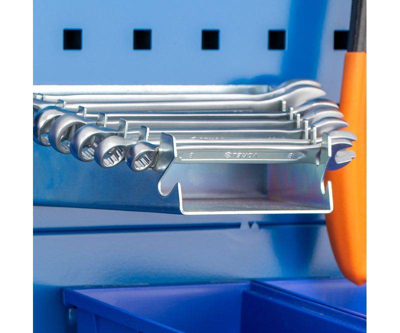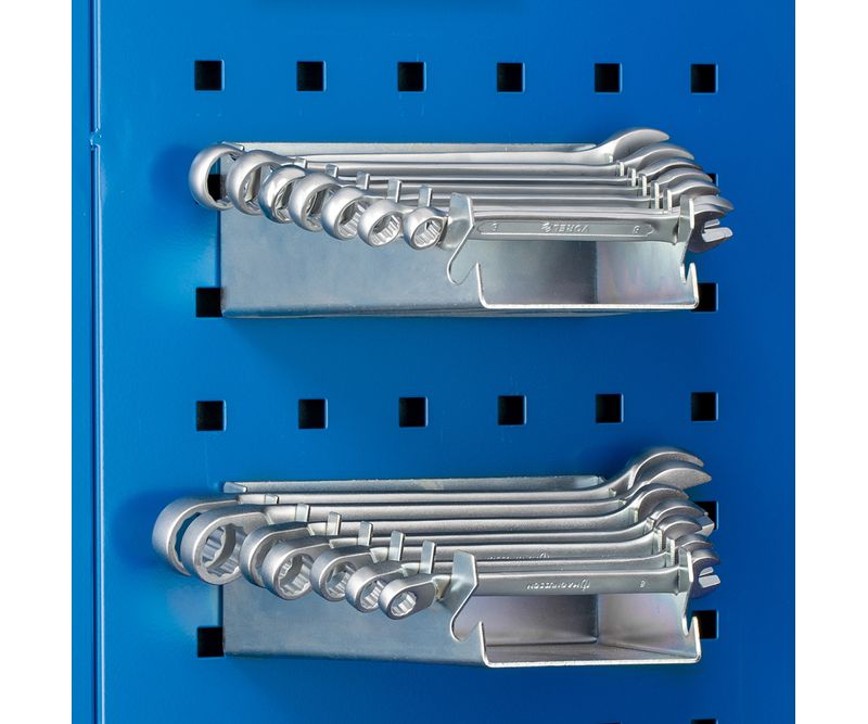 Suport pentru chei Suportul practic pentru chei fixe si chei inelare va va permite sa le depozitati fara dezordine si cautari inutile. Puteti agata raftul oriunde pe perete si sa aveti cheile la indemana de fiecare data cand aveti nevoie de ele. Suportul este foarte robust si prezinta rezistenta la coroziune, deoarece este fabricat din otel galvanizat. Poate fi utilizat pe panoul perforat al bancurilor de lucru BRUNO, DAREK si SZYMON. * Dimensiunile prezentate pot varia usor (1-3mm), dar acest lucru nu afecteaza utilizarea. * Suportul nu include accesoriile prezentate in imagini.