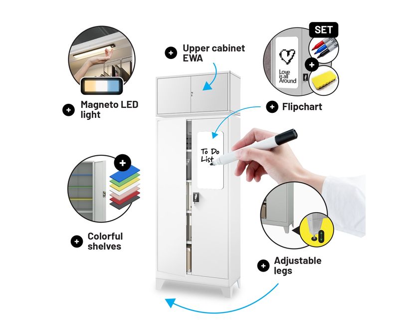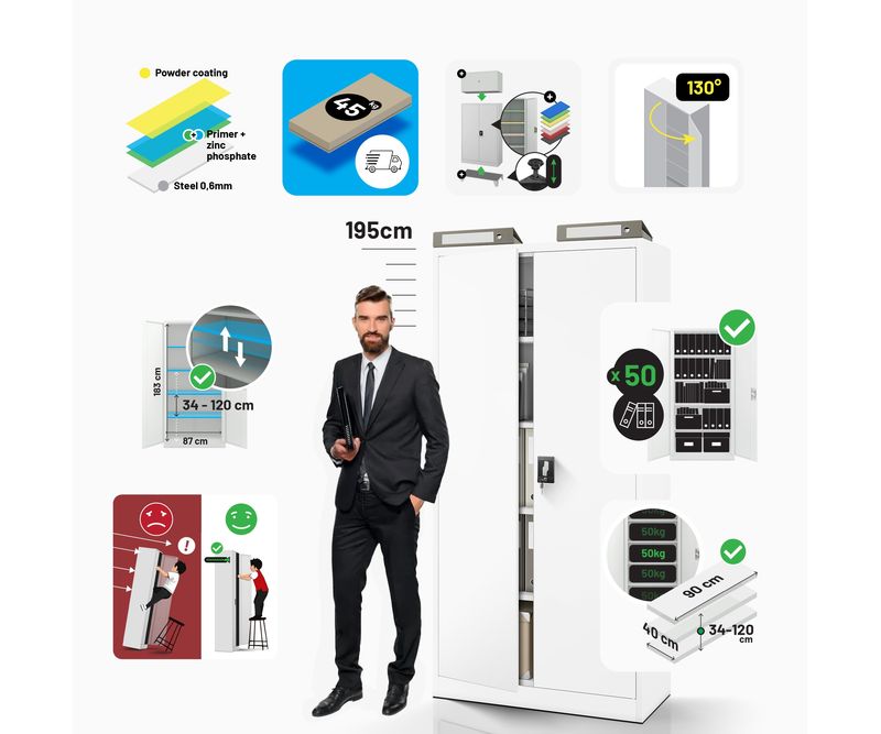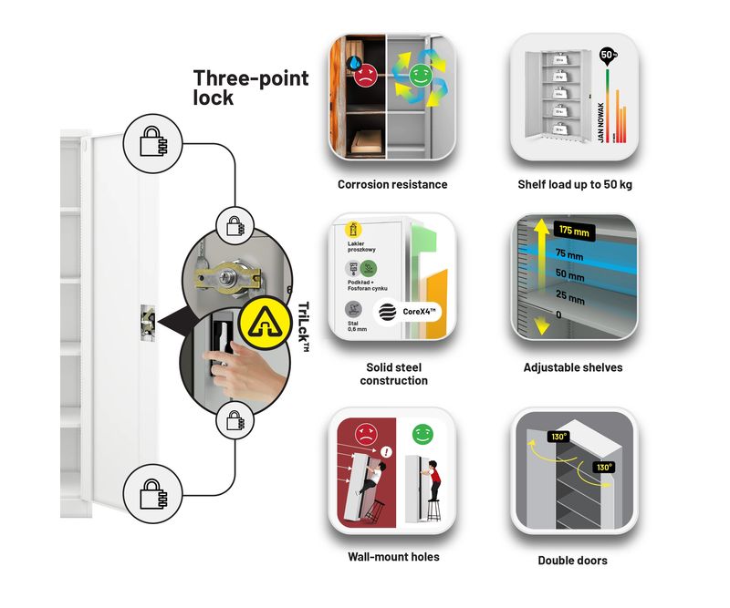 Dulap JAN H - otel, antracit, universal, pentru birou, scoala, atelier Exista multe modele de dulapuri pe piata, dar putine sunt la fel de versatile ca si dulapul metalic cu incuietoare JAN. Nu numai ca este excelent pentru depozitarea documentelor companiei, dar puteti pastra in el si medicamente sau tot felul de unelte in siguranta. Cele mai comune utilizari: dulap birou dulap medical dulap scule Companiile, scolile si birourile sunt principalii nostri clienti. Cu toate acestea, dulapurile cu incuietoare din otel JAN sunt din ce in ce mai mult folosite de persoanele fizice, care le aleg pentru a-si mobila interioarele datorita aspectului lor industrial minimalist si la moda. Dulap depozitare din metal JAN - caracteristici cheie ale produsului Dulapul de depozitare din metal JAN este un produs care nu numai ca este extrem de rezistent, dar este si conceput pentru a satisface toate cerintele utilizatorilor sai. Puteti adapta cu usurinta rafturile reglabile la nevoile D-voastra si puteti depozita in el tot ceea ce aveti nevoie. capacitate impresionanta (pana la 50 de dosare) 4 rafturi reglabile, fiecare cu o capacitate de incarcare de pana la 50 kg, reglabile in trepte de 25 mm. sistem de inchidere in 3 puncte (2 chei incluse) otel acoperit cu vopsea pulbere de 0,6 mm grosime, rezistent la deteriorari mecanice cu 2 usi dulapul nostru metalic a fost prevazut cu gauri pe partea din spate si laterala pentru a putea fi fixat pe un perete. Acest lucru va spori siguranta utilizarii zilnice. gaurile din partea superioara a dulapului fac posibila atasarea unei extensii. Specificatii - dulap metalic JAN inaltime 195 cm latime 90 cm adancime 40 cm greutate 45 kg culoare: alb (RAL 9003) Motivul pentru care merita? Garantie de calitate - Cele mai bune materiale si fara compromisuri in ceea ce priveste calitatea fabricatiei. Siguranta - Dulapul din otel JAN este certificat de Institutul National de Igiena. Acest lucru inseamna ca il puteti utiliza liber pentru a va indeplini scopurile. RODO 2018 - Dulapul de arhivare JAN a fost dezvoltat cu scopul RODO 2018 in minte si indeplineste toate cerintele asociate cu reglementarile. Important: Dulapul de birou metalic este livrat pe bucati si, prin urmare, necesita montare. Colectia JAN NOWAK Garantia celei mai inalte calitati este oferita de marca JAN NOWAK, unul dintre cei mai mari furnizori de dulapuri metalice din Europa. Nu uitati ca, apeland la serviciile unei unitati apreciate si dovedite, va puteti baza pe produse si servicii de inalta calitate.