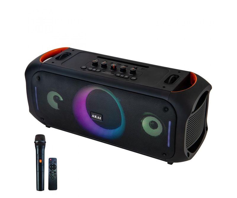 Boxa portabila Akai cu microfon fara fir si telecomanda, bluetooth 5.3 putere 80W, puterea de emisie a canalului BT 2 dbm, baterie 7,4 V, 6000 mAh, tip baterie Litiu-ion, radio FM 87.5-108MHz, frecventa microfonului 2402-2480 MHz, cu intrare AUX, slot USB si card TF, formate audio acceptate MP3, WAV, WMA, FLAC, APE, raspuns in frecventa 60 Hz-18 kHz, timp de incarcare max 6,5 ore (5V/2A), timp de redare 4,5-5,5 ore (80% volum), negru
