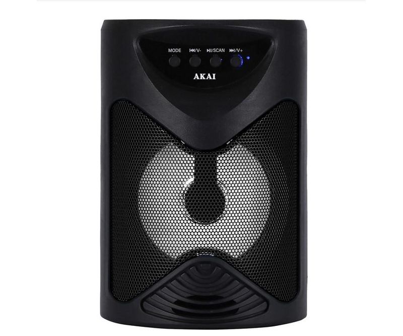 Boxa portabila Akai ABTS-704, Bluetooth 4.2, radio FM, 1x port USB pentru mp3 player, 1x slot card TF, lumini LED, baterie reincarcabila, 1x slot pentru microfon, timp de incarcare 2 ore, timp de folosire 1.5 ore la volum maxim
