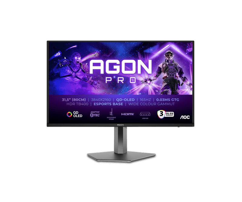 Monitor AOC 31.5 AG326UD, Diagonal (inch): 31.5, Diagonal (cm): 80, Aspect ratio: 16:9, Panel: QD-OLED, Resolution: 3849x2160, Refresh Rate: 165Hz, Response time GtG: 0.03ms, Brightness (max): 1000 cd/m², Contrast (static) : 1.5M:1, Viewing angle: 178/178, Color Gamut Type: DCI-P3, Color Gamut Coverage: 99%, Colours: 1.07B, Speakers: 8Wx2, VESA Wallmount: 100x100, Tilt: -5/+25, HAS: 150mm, Pivot: Yes, Swivel: -16/16, HDMI: x2, DisplayPort: x1, USB Hub: x3 USB-A 3.2 / x1 USB-B 3.2, AUX: x1 3.5mm Audio OUT