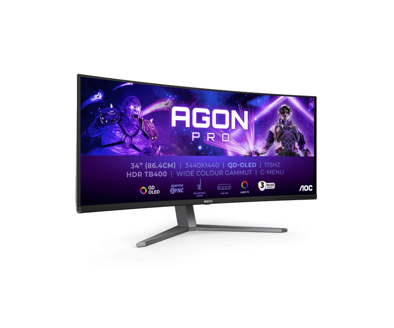 Monitor Aoc 34 AG346UCD, Curvature: 1800R, Diagonal (inch): 34, Diagonal (cm): 86, Aspect ratio: 21:9, Panel: QD-OLED, Resolution: 3440x1440, Refresh Rate: 175Hz, Response time GtG: 0.03ms, Brightness (max): 1000 cd/m², Contrast (static) : 1.5M:1, Contrast (dynamic): Mega Infinity DCR, Viewing angle: 178/178, Color Gamut Type: DCI-P3, Color Gamut Coverage: 99.3%, Colours: 1.07B, Speakers: 8Wx2, VESA Wallmount: 100x100, Tilt: -5/+25, HAS: 130mm, Swivel: -30/30, HDMI: x2, DisplayPort: x1, USB Hub: x3 USB-A 3.2, AUX: x1 3.5mm Audio OUT