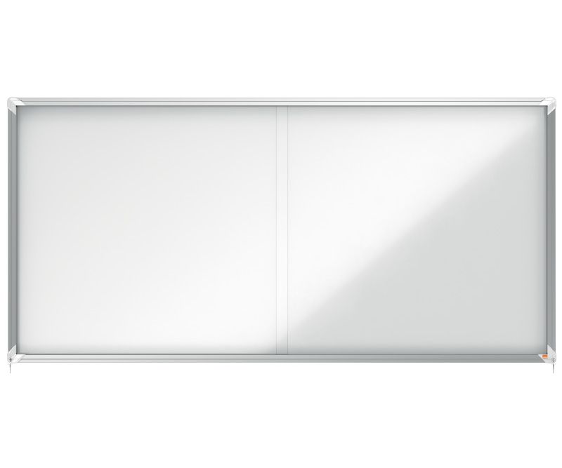 Avizier Nobo magnetic pentru interior, cu ușă glisantă din sticlă și blocare pe colț. Încadrat într-o ramă de aluminiu cu design modern, ce se fixsează pe perete atât prin colțuri, cât și cu ajutorul unei șine. Suprafață din oțel emailat, magnetic, de culoare alb, pentru a afișa în siguranță documentele. Dimensiuni: 27xA4, 2000x970 mm.