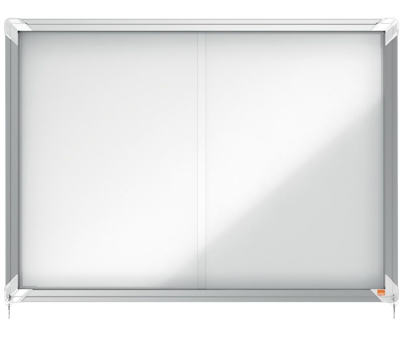 Avizier Nobo magnetic pentru interior, cu ușă glisantă din sticlă și blocare pe colț. Încadrat într-o ramă de aluminiu cu design modern, ce se fixsează pe perete atât prin colțuri, cât și cu ajutorul unei șine. Suprafață din oțel emailat, magnetic, de culoare alb, pentru a afișa în siguranță documentele. Dimensiuni: 8xA4, 925x668 mm.