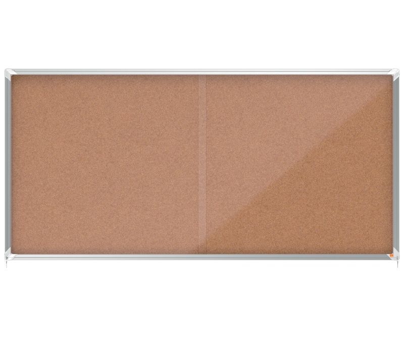 Avizier Nobo din plută, pentru interior, cu ușă glisantă din sticlă și blocare pe colț. Încadrat într-o ramă de aluminiu cu design modern, ce se fixsează pe perete atât prin colțuri, cât și cu ajutorul unei șine. Suprafață din plută rezistentă, pentru a afișa în siguranță documentele. Dimensiuni: 27xA4