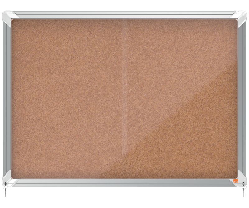 Avizier Nobo din plută, pentru interior, cu ușă glisantă din sticlă și blocare pe colț. Încadrat într-o ramă de aluminiu cu design modern, ce se fixsează pe perete atât prin colțuri, cât și cu ajutorul unei șine. Suprafață din plută rezistentă, pentru a afișa în siguranță documentele. Dimensiuni: 8xA4