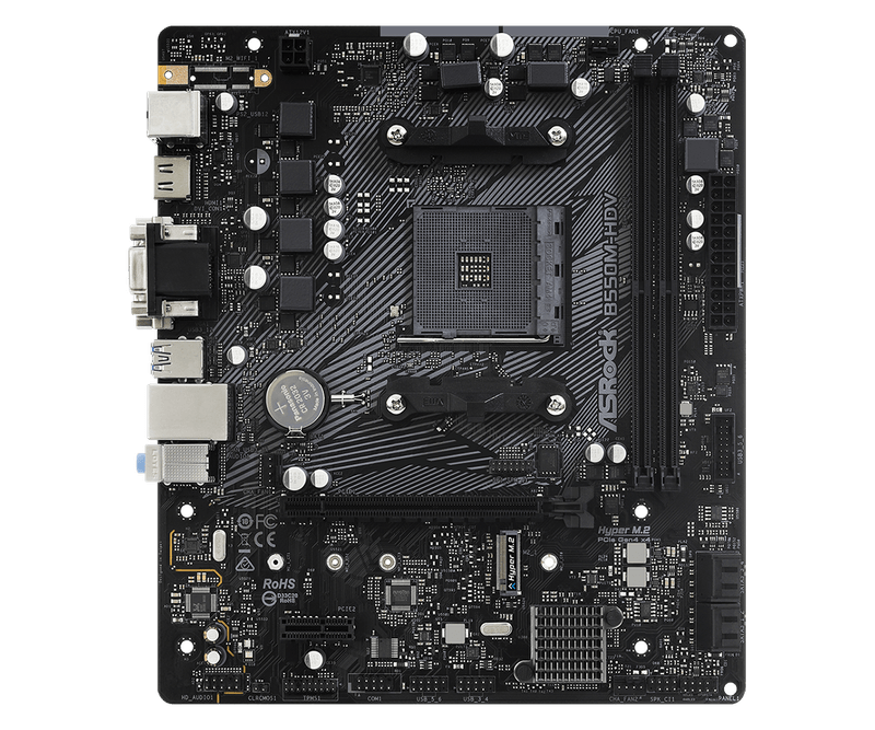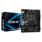 Placa de baza AsRock B550M-HDV AM4 Supports AMD AM4 Socket Ryzen™ 3000, 4000 G-Series and 5000 Series Desktop Processors 6 Power Phase Design Supports DDR4 4733+ (OC) 1 PCIe 4.0 x16, 1 PCIe 3.0 x1 Graphics Output Options: HDMI, DVI-D, D-Sub 7.1 CH HD Audio (Realtek ALC887 Audio Codec) 4 SATA3, 1 Hyper M.2 (PCIe Gen4 x4 & SATA3) 6 USB 3.2 Gen1 (2 Front, 4 Rear) Gigabit LAN https://www.asrock.com/MB/AMD/B550M-HDV/index.asp#Specification