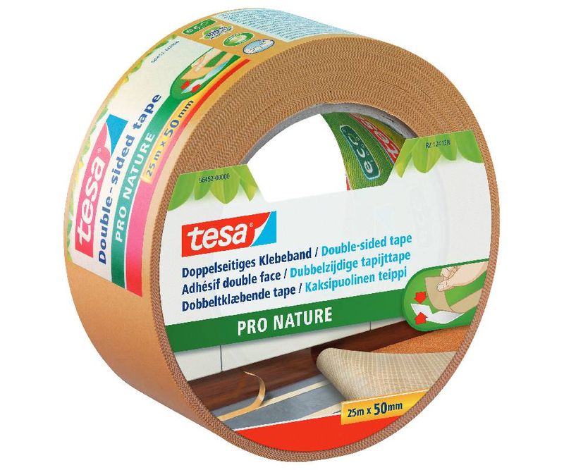 Banda dublu adezivă Tesa Double-Sided Tape PRO NATURE combină sustenabilitatea cu funcționalitatea. Este banda de fixare dublă față sustenabilă, potrivită pentru o lume prietenoasă cu mediul înconjurător. Pentru a reduce exploatarea resurselor naturale, este fabricată din materiale plastice 100% reciclate și folosește un strat de adeziv fără solvenți. Chiar și folia din ambalajul produsului este realizată din materiale reciclate.