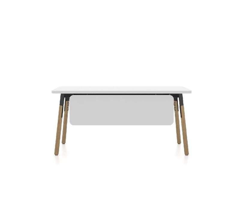 Blat din pal melaminat de 30 mm, panou frontal de 18 mm, cant PVC de 2 mm. Picioare cu profil cilindric din metal si lemn de fag masiv.