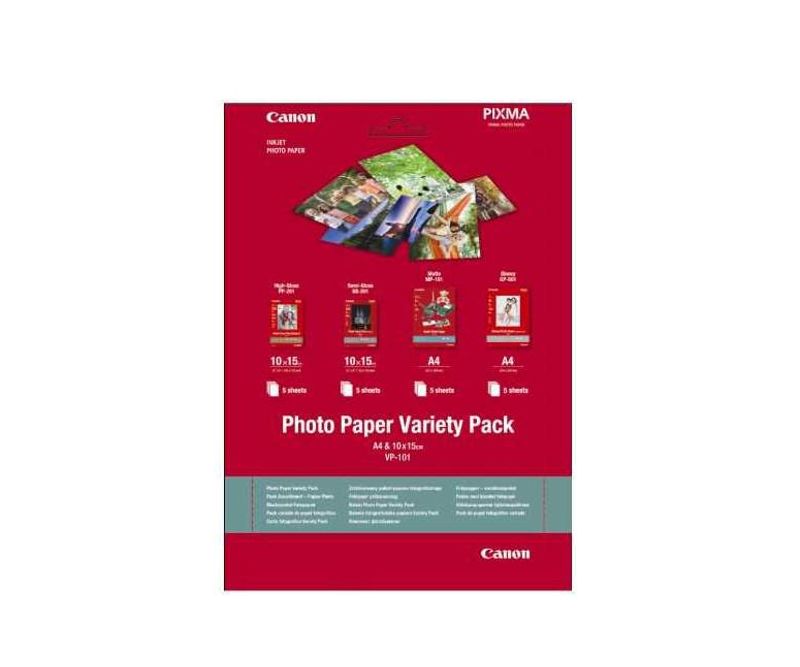 Hartie foto Canon VP-101S Variety Pack, dimensiune 10x15cm, greutate 200g/m2, 20 coli, 5 High gloss, 5 semi gloss, 5 matte, 5 glossy.