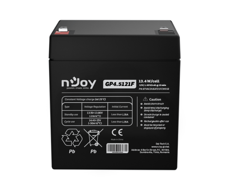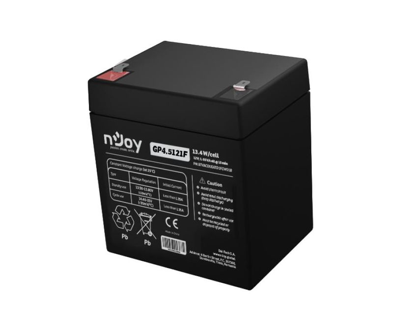 Acumulator nJoy GP4.5121F 12V Capacitate 14,95W/cell evaluat la 1.65V/cell @ 15 min, Tensiune 12V, Tip VRLA, Caracteristici Sigilata complet si fara intretinere, Peste 260 de cicluri la 100% DOD, Utilizare standard 3-5 ani, Auto-descarcare redusa, Conectori : F1 - Faston Tab 187