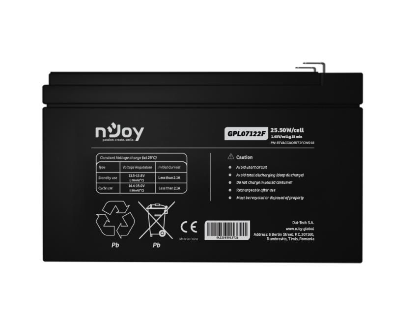 Acumulator nJoy GPL07122F 12V 22.72W/cell, Capacitate 22.72W/cell evaluat la 1,65V/cell@15 min), Tensiune 12V, Tip VRLA - fara mentenanta, Caracteristici: Sigilata complet si fara intretinere, Peste 260 de cicluri la 100% DOD, Utilizare standard 5-8 ani, Auto-descarcare redusa, Conectori : F2 - Faston Tab 250, Aplicabilitate: Sisteme de alarma, Sisteme de securitate, Televiziune prin cablu, Echipamente de comunicare, Echipamente medicale, UPS, Scule electrice, Echipamente de control, Jucarii