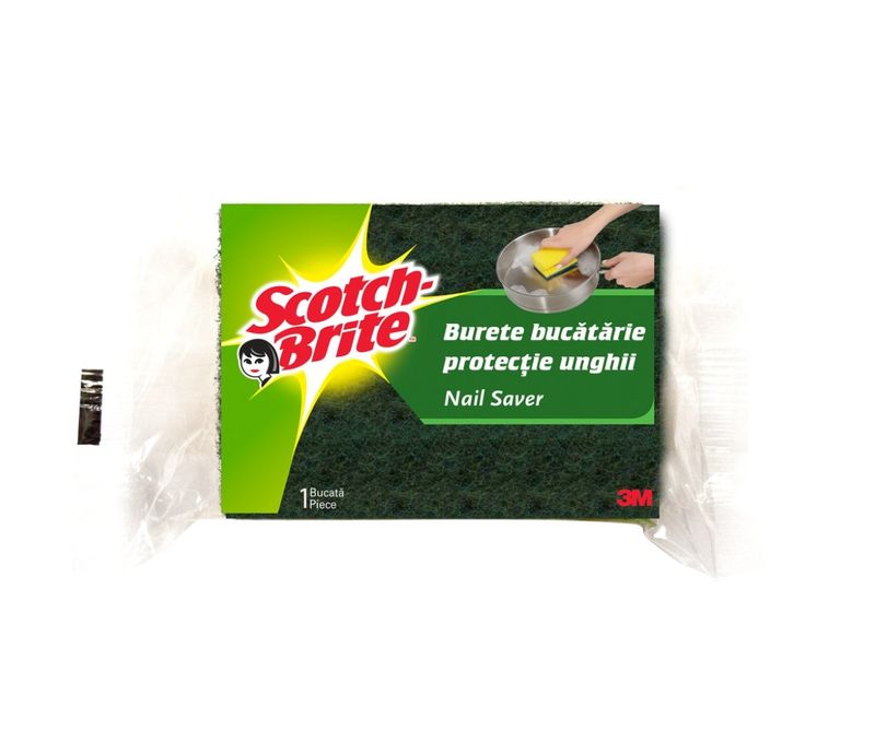 Buretele de vase Scotch-Brite este primul burete conceput cu canale laterale ce au rolul de a proteja unghiile in timpul spalarii vaselor.