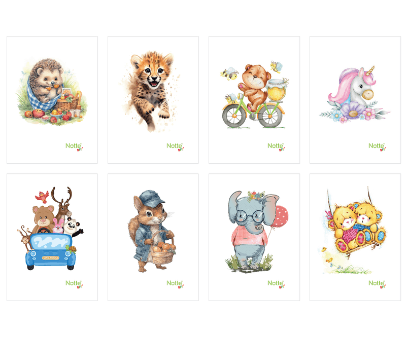 Descoperă colecția adorabilă de caiete A4 cu 60 de file dictando, din gama BFF Notte – perfecte pentru orele de limba română, teme sau scriere de mână! Fiecare caiet are o copertă ilustrată cu personaje simpatice în culori pastel, cu detalii jucăușe: de la animăluțe prietenoase și pui de leopard, până la unicorni sau elefanți cu ochelari. Formatul capsat îl face ușor de folosit, ideal pentru elevii de toate vârstele.