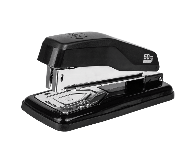 Capsator robust cu mecanism de capsare rotativ, ideal pentru uz intens la birou sau acasă. Poate capsa până la 50 coli de hârtie (80 gsm) și suportă capse 24/6, 26/6 și 24/8. Nicovala rotativă permite capsare închisă sau tip cui, iar adâncimea de pătrundere în pagină este de 90 mm. Capacitate magazie: până la 100 capse, cu încărcare frontală ușoară.