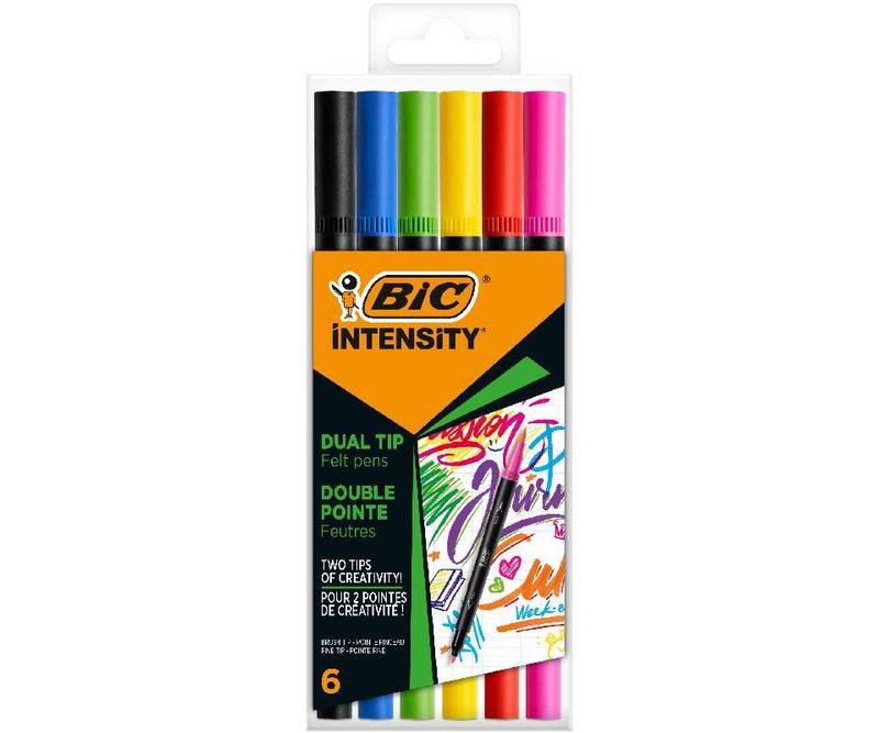 Markerul BIC Intensity Dual Tip va va face sa va intrebati care capat este cel de sus! Aceasta cutie contine 6 carioci de colorat cu 2 varfuri, in culorile rosu, roz, albastru, verde, galben si negru, o combinatie de varfuri moi tip pensula si markere subtiri.