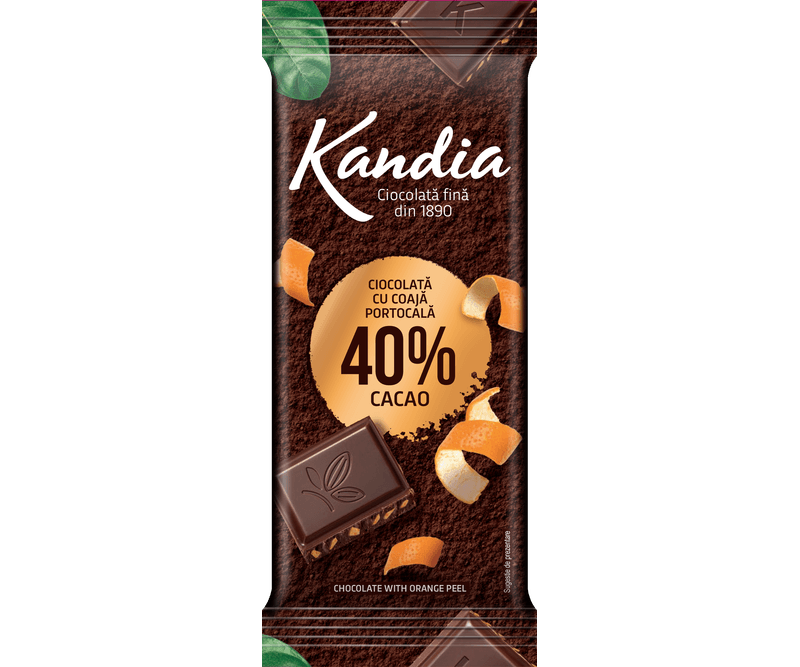 Kandia – ciocolata cu tradiție și gust autentic, îmbogățită cu aroma delicată a portocalelor confiate.