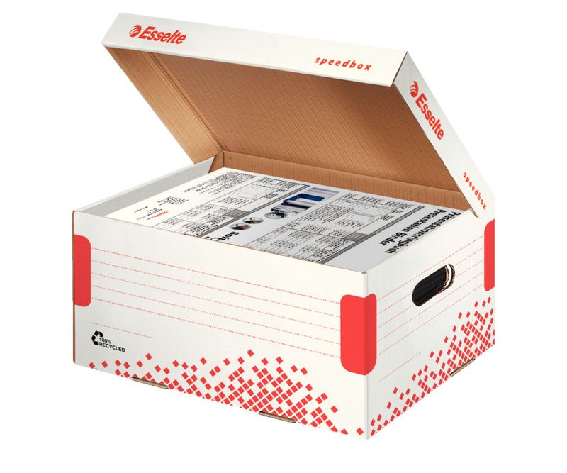 Cu Esselte Speedbox economisești timp și efort. Sunt gata pentru utilizare dintr-o singură mișcare. Se asamblează ușor și intuitiv, în doar câteva secunde, fără a avea nevoie de instrucțiuni.