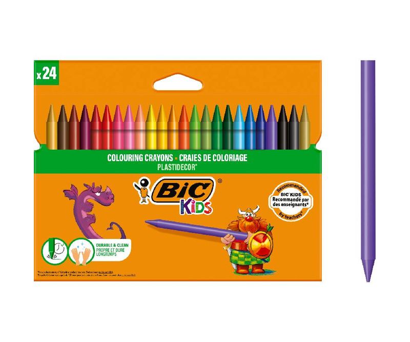 Fie ca vorbim de casa sau scoala, creioane cerate de colorat BIC Kids Plastidecor sunt perfecte pentru a introduce copiii in lumea minunata de colorare si desen incepand de la 30 de luni. Curcubeul de 24 culori include nuante vibrante care dau frau liber imaginatiei micilor nostri artisti.