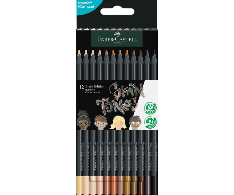 Lemn negru si mina supermoale. Productie carbon neutra. Mina moale, pentru efecte minunate chiar si pe hartie de culoare inchisa. Creioane colorate cu forma ergonomica triunghiulara. Culori stralucitoare. Aplicare foarte usoara. Mina rezistenta la rupere datorita procesului de lipire securizata SV. Lemn din surse sustenabile certificate. Set de 12 culori in tonurile pielii.