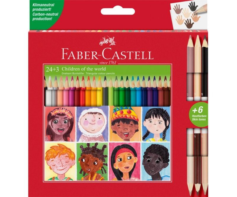 Creioane colorate triunghiulare – culorile incluse au fost atent selectate de profesori de arta. Forma lor triunghiulara ergonomica ofera o prindere mai buna si confortabila pentru mainile copiilor. Setul include 24 creioane colorate si 3 creioane bicolore cu 6 tonuri de piele. Culori stralucitoare, matasoase. Lipire speciala SV pentru prevenirea ruperii minei. Culori lavabile de pe majoritatea textilelor. Lemn din silvicultura durabila certificata. Set de 27 buc. #faptebune