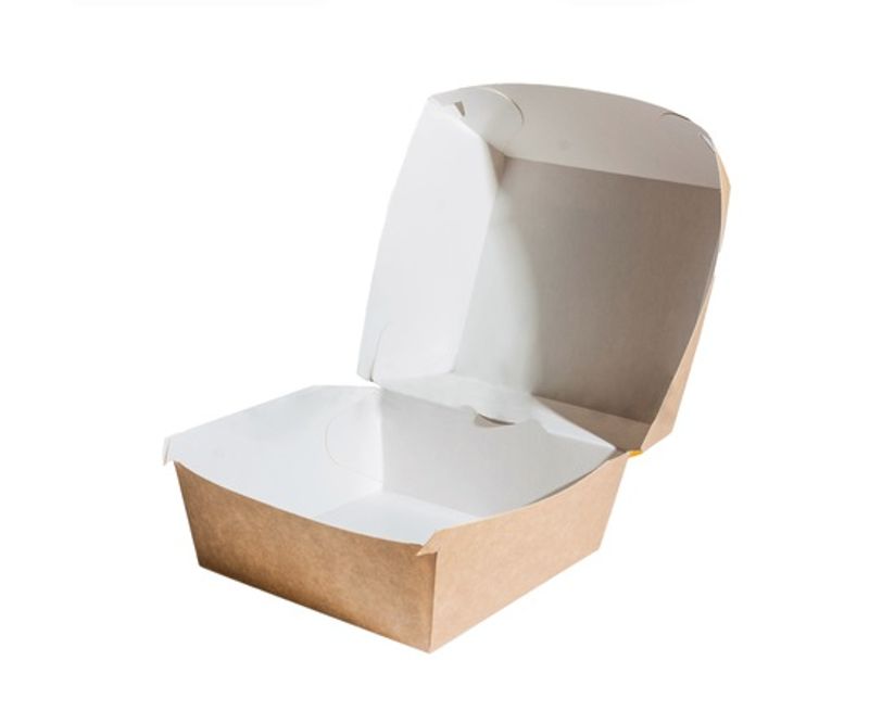 Cutia de burger din carton natur, cu dimensiunile 95 x 95 x 75 mm, este soluția ideală pentru ambalarea burgerilor mici sau a preparatelor tip fast-food. Fabricată din carton reciclabil, cu autoasamblare rapidă (fără lipire), această cutie oferă o prezentare estetică, practică și sustenabilă.