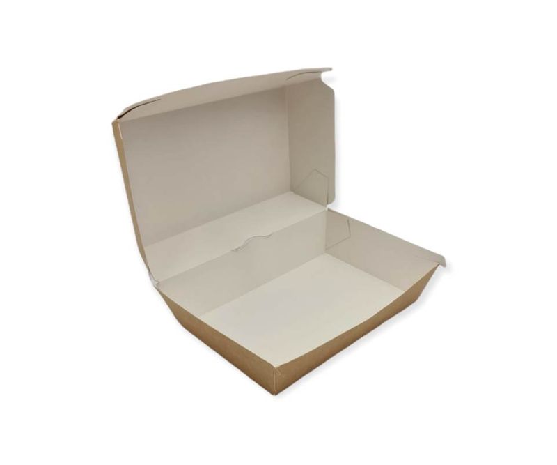 Cutia meniu burger natur CLMSHM1800 SL este soluția ideală pentru ambalarea, transportul și servirea burgerilor într-un mod sustenabil și eficient. Fabricată din carton natur 100% reciclabil, această cutie este sigură pentru contactul direct cu alimentele și oferă o prezentare estetică, potrivită pentru restaurante, food truck-uri, catering sau livrări. Designul său robust asigură protecția produsului și păstrează prospețimea preparatelor.