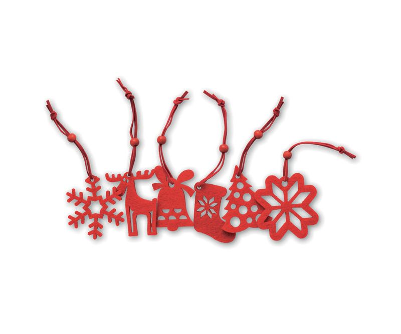 Set de 6 decoratiuni pentru pomul de Craciun, din pasla. 6 modele diferite: brad, fulg de zapada, clopotel, cizma, Craciunita si cerb.