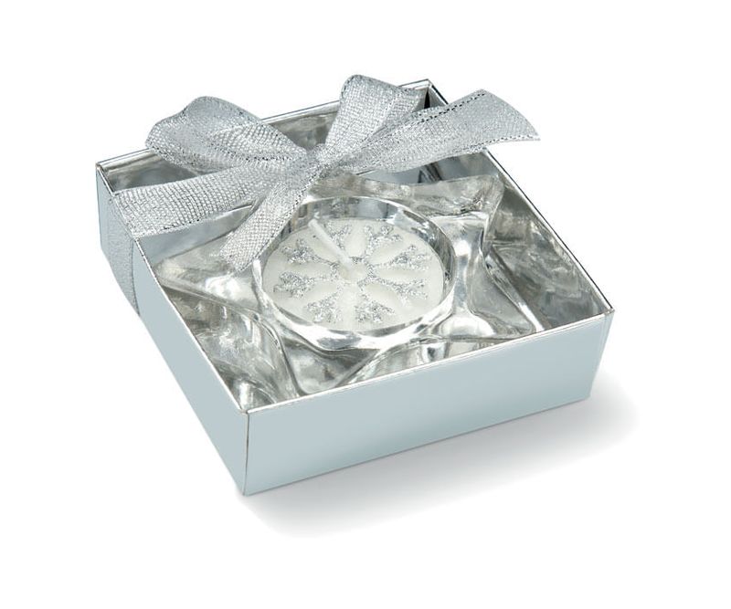 Suport din sticla pentru lumanare , sub forma de stea. Prevazut cu capac transparent si fundita decorativa. Include lumanare.
