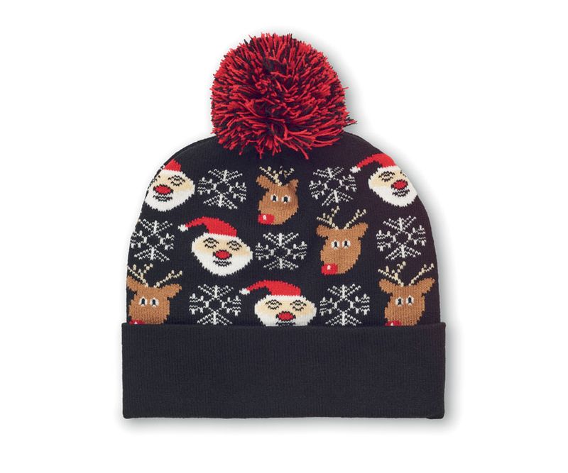 Caciula tricotata de Craciun cu manseta si mot din acrilic moale si elastic.