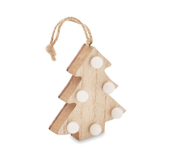 Decoratiune brad din lemn (80% lemn de plop si 20% lemn de buruieni), cu 6 lumini LED si snur. Include 1 baterie CR2032. Lemnul este un produs natural, in consecinta pot aparea diferente de culoare, dimensiune sau la personalizare.