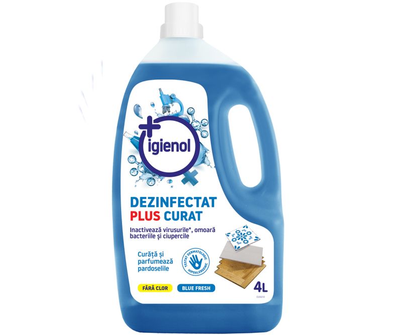 Dezinfectantul universal Igienol Blue 4 L este soluția ideală pentru curățarea și igienizarea eficientă a suprafețelor mari, fără a folosi clor. Formula sa avansată elimină virusurile testate*, bacteriile și fungii responsabili de murdărie și mirosuri neplăcute, oferind un nivel ridicat de protecție în locuințe, instituții sau spații comerciale. Mirosul plăcut și formula delicată permit utilizarea frecventă pe aproape orice tip de suprafață, fără a deteriora materialele. Igienol Blue este o alegere excelentă pentru întreținerea zilnică și pentru menținerea unui mediu curat, sigur și proaspăt. Produs fabricat în România.
