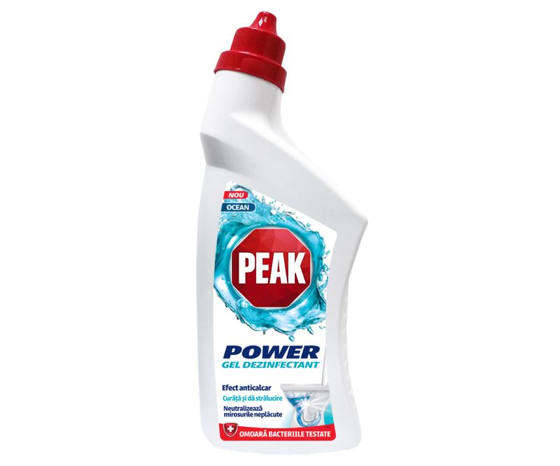 Peak Power Gel Dezinfectant Ocean este o solutie pentru dezinfectarea toaletei care omoara bacteriile testate, curata impecabil, previne depunerile de calcar si parfumeaza intens toaleta. Produs fabricat in Romania.
